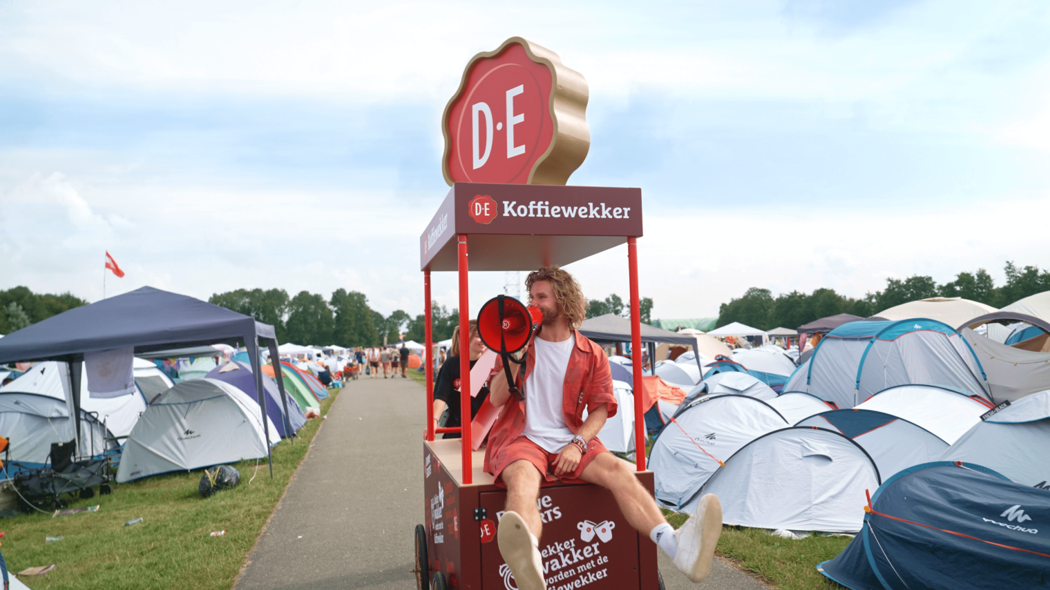 “Een hele goedemorgen Lowlands, hier zijn we weer! Je favoriete Koffiewekkers van Douwe Egberts”. Iedere morgen trokken we, gewapend met rugzakken vol dampende en heerlijk geurende koffie over de campings. De koffie werd geserveerd in iconische D.E-bekers met daarop festival-specifieke gespreksstarters om de verbinding tussen mensen op te starten. Met zowel kleine oogjes als een grote glimlach werd de warme koffie in dank afgenomen. Mooie gesprekken, wilde verhalen en enthousiaste plannen werden, al staande rond de koffiekar, gedeeld.